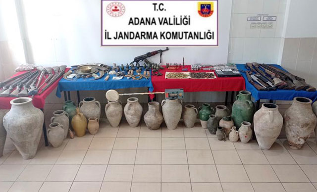 Adana'nın Pozantı ilçesinde jandarma ekiplerinin tarihi eser kaçakçılarına yönelik düzenlediği operasyonda çok sayıda el bombası, roketatar mühimmatı, dinamit, fünye, tüfek ...